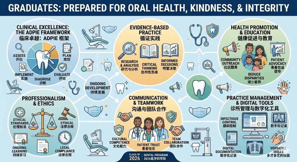 Graduates of our program are now well-prepared about oral health, and they’re committed to serving with kindness and integrity. They work seamlessly with healthcare teams to promote better oral and overall health. Their core skills include clinical therapy, using the ADPIE framework (Assess, Diagnose, Plan, Implement, Evaluate) to care for diverse populations in both English and Chinese. They embrace evidence-based practices by thinking critically, researching, and analyzing data to make informed decisions across different settings. Our graduates are passionate about health promotion and education, advocating strongly for oral health and aiming to reduce disparities.
